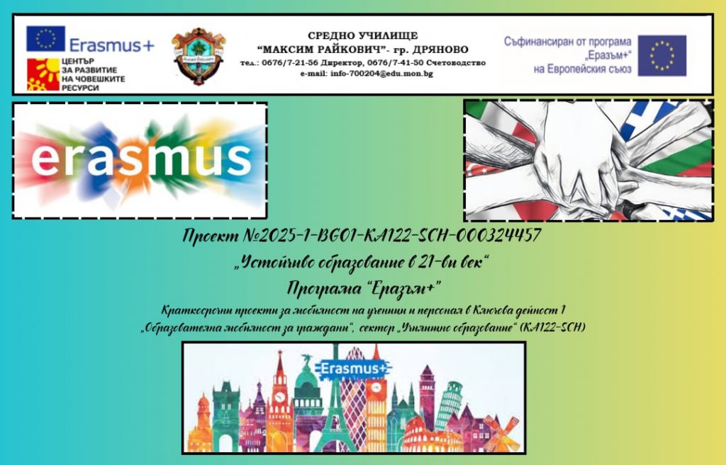 Средно училище „Максим Райкович“ – град Дряново кандидатства по Програма „Еразъм+“ за Краткосрочни проекти за мобилност на ученици и персонал в Ключова дейност 1 „Образователна мобилност за граждани“, сектор „Училищно образование“ (KA122-SCH) чрез проект „Устойчиво образование в 21-ви век“ през месец февруари 2025 година. Проектът на училището ни с №2025-1-BG01-KA122-SCH-000324457 е одобрен за финансиране през месец юни 2025 година.