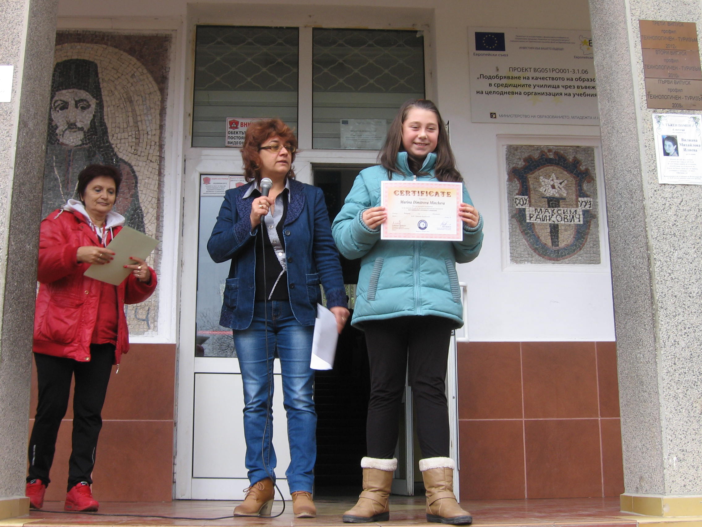 Директорът на училището връчи медали и сертификати от Международното математическо състезание „Математика без граници – есен 2014“. Сребърни медали получиха: Ивета Галинова Христова от VII б клас, Катерина Георгиева Тумбалова от VII а клас и Евтим Иванов Анастасов – IV a клас. Бронзов медал получи Веселин Мирославов Денчев – VII б клас.
